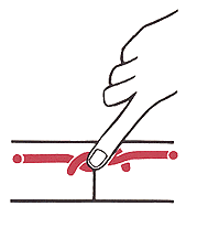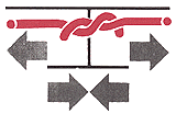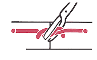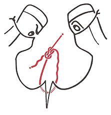 Das eigentliche Problem beim Knüpfen ist also die exakte Plazierung des Knotens, um dem Faden die gewünschte Spannung zu geben. In der Regel rutscht die erste Schlinge bei den meisten Faden-Materialien zurück, insbesondere wenn das Gewebe unter Spannung steht. Mit der zweiten Schlinge läßt sich die Fadenspannung sehr fein dosieren, wenn man sie wie oben gezeigt, so anlegt, daß beide Knotenschlingen zusammen auf dem anderen Fadenende verschieblich sind. Richtig plaziert sitzt dieser Rutschknoten so fest, daß er spontan nicht wieder aufgleitet. Daher ist es am sichersten, beide Knoten in der beschriebenen Weise anzulegen, hinunterzuschieben und durch weitere gegensinnige Schlingen, deren Gesamtzahl vom Fadenmaterial abhängt, zu sichern. Von Knoten zu Knoten sollte dabei mit verstärkter Kraft geknüpft werden, um einen sicheren Sitz der oberen Knoten zu erreichen, ohne die Fadenschlaufe ungewollt weiter einzuengen. Das Hinabgleiten des Knotens im »Rutschknoten« erfolgt in der Regel durch Gleiten auf dem gerade gehaltenen anderen Faden, fast nie wie oft angenommen wird indem der Faden durch die Knoten läuft. Hierbei ist zu beachten, daß der Rutschknoten nicht zu hoch angesetzt wird, da es beim Hinabschieben des Knotens leicht zu einer Zerrung des Gewebes und vErschiebung der Wundränder kommen kann. |