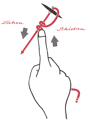 aber nur an einem Fadenende angezogen, das gestreckt gehalten wird! Das andere Fadenende bleibt gelockert, ... und der Knoten gleitet
