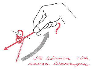 Hier ist ein Knoten erforderlich, der gleitet ... der sich nicht vorzeitig festzieht, und der doch hält! Man muß einen Knoten machen, der sich kurzfristig wie ein Lasso verhält, und der dann zu einem »Schiffer-Knoten« wird.